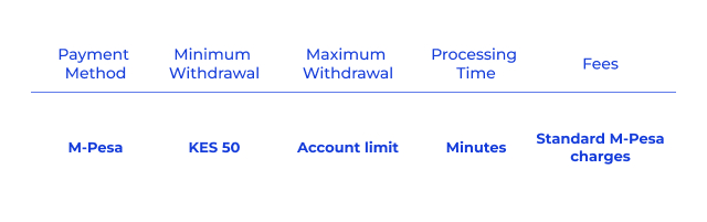 Shabiki lets users withdraw money through M-Pesa, which lets them move their winnings straight to their mobile money accounts. To do this, you usually have to go to the app or mobile site's withdrawal section, choose M-Pesa as the payment method, and type in the amount you want and the phone number.