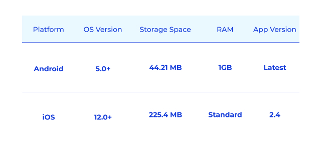 Les exigences Android sont modestes. La plupart des téléphones de ces dernières années gèrent facilement l'application de 44,21 Mo. iOS demande plus de stockage à 225,4 Mo, mais fonctionne sur les appareils sous iOS 12.0, couvrant efficacement les anciens iPhones et iPads.