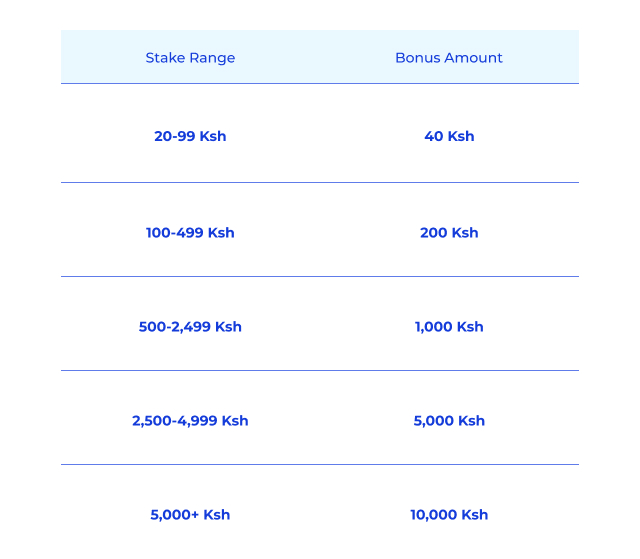 Les nouveaux clients peuvent réclamer des bonus sur leurs trois premiers paris, le pari d'ouverture offrant jusqu'à Ksh. 10,000. La structure des bonus fonctionne sur un système à plusieurs niveaux qui récompense les enjeux plus importants avec des bonus proportionnellement plus importants.