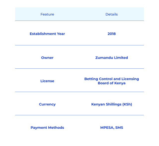 Les shillings kenyans (KSh) sont le principal moyen de paiement accepté sur le site. Les options MPESA et SMS sont disponibles comme méthodes de paiement pour les dépôts et les retraits. Outre une variété de jeux de casino, le portefeuille de jeux comprend un large éventail de sports, notamment le rugby, le basket-ball, le football et des marchés de niche comme le hockey sur glace.