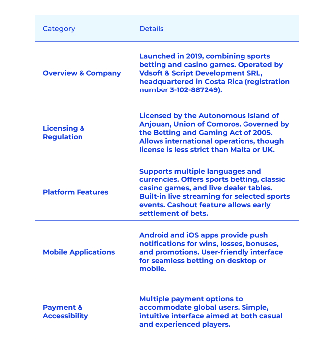 L'île autonome d'Anjouan, Union des Comores, a accordé à Megapari une licence d'exploitation. Celle-ci opère conformément à la loi de 2005 sur les jeux et paris d'Anjouan. Cette autorisation réglementaire permet à la plateforme de proposer des services de jeux d'argent en toute légalité, mais les licences d'Anjouan sont considérées comme moins strictes que celles de Malte, du Royaume-Uni ou de Curaçao. Bonus et promotions chez Megapari