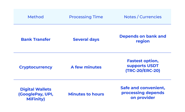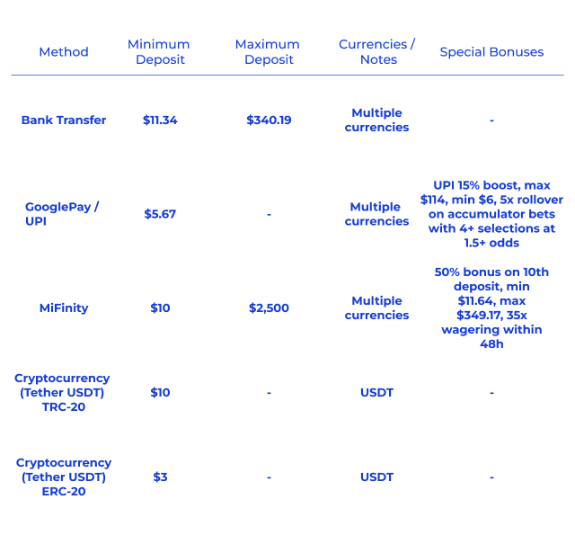 La plateforme accepte différents modes de paiement, tels que les virements bancaires, Google Pay, UPI et MiFinity. Le Tether (USDT) est utilisable sur de nombreux réseaux par les personnes intéressées par les cryptomonnaies. Les joueurs bénéficient ainsi d'options bancaires modernes.