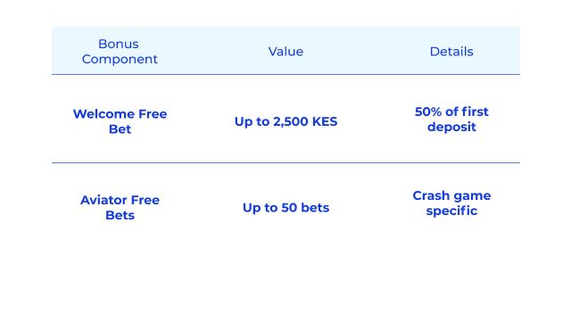 Les nouveaux joueurs peuvent réclamer un pari gratuit de 50% atteignant jusqu'à 2 500 KES sur leur dépôt initial. Ce pack de bienvenue s'étend au-delà des paris sportifs traditionnels. L'offre comprend jusqu'à 50 Paris gratuits spécifiquement pour Aviator, le jeu de crash populaire qui a attiré l'attention de la communauté des joueurs du Kenya.