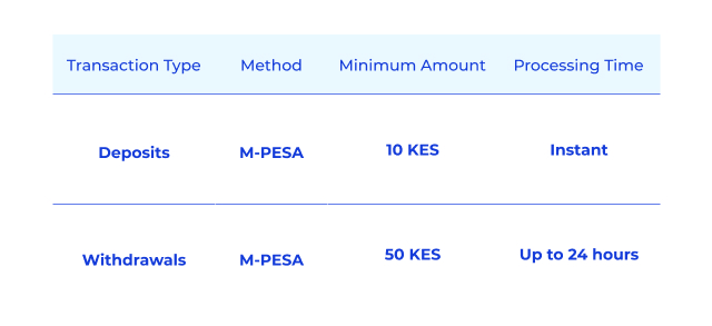 Les joueurs kenyans peuvent approvisionner leurs comptes principalement via M-PESA en utilisant la fonction Payer la facture. Les magasins de paris physiques offrent une méthode de dépôt alternative pour ceux qui préfèrent les transactions en personne.