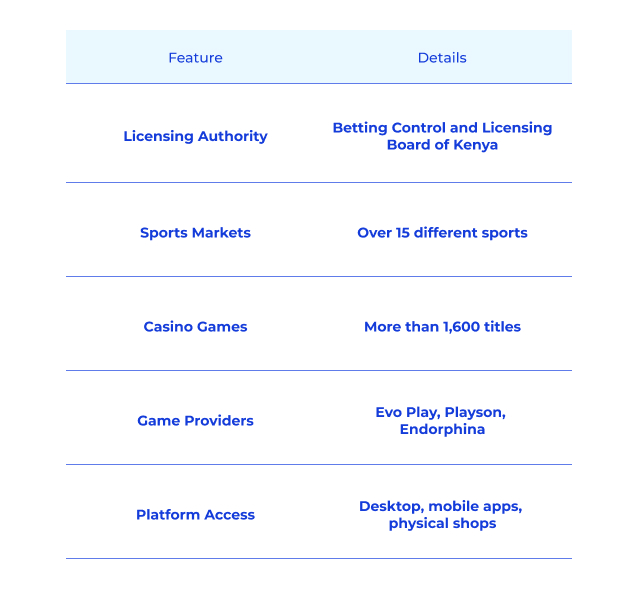 Il fonctionne sous licence complète du Betting Control and Licensing Board du Kenya. Cette autorisation officielle rend la plateforme totalement légale pour les joueurs kenyans. La plateforme implémente également des technologies de cryptage SSL et de pare-feu pour la sécurité et la protection des données.