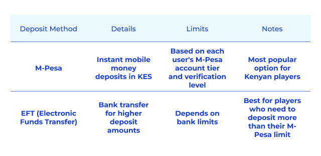 Vous pouvez utiliser M-Pesa ou un virement bancaire pour effectuer des dépôts et des retraits sur Shabiki. La plupart des joueurs kenyans seront satisfaits de l'une ou l'autre de ces deux options, qu'ils privilégient la rapidité du paiement mobile ou le virement bancaire traditionnel. Ces deux méthodes sont reconnues comme étant sûres pour la gestion de l'argent des paris.