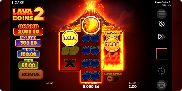 Obtenir deux symboles Bonus et un symbole Collect déclenche trois tours gratuits dans le jeu bonus. Les symboles Collect restent alors verrouillés et accumulent les valeurs de tous les symboles bonus visibles, y compris les jackpots fixes Mini, Minor, Major et Grand. Les joueurs peuvent également activer le mode Lava Spins pour 15 fois la mise, garantissant ainsi au moins un symbole Bonus et un symbole Collect à chaque tour.