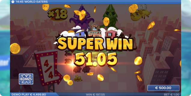 Conçue comme une machine à sous à 5 colonnes et 5 rangées, World Eaters introduit des mécanismes d'évolution du monde dynamiques qui renouvellent constamment le gameplay. Au fil de la progression, la grille de jeu s'agrandit, offrant de plus grandes opportunités de gains grâce aux pièces, aux multiplicateurs et à une multitude de fonctionnalités explosives.