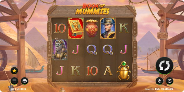 Construit sur une grille classique 3x5 avec 10 lignes fixes, Book of Mummies combine le charme intemporel des machines à sous « Book » traditionnelles avec la touche moderne et immersive propre à GameBeat. Le mystérieux Livre des Momies joue un double rôle — il remplace n’importe quel symbole pour former des combinaisons gagnantes et agit comme clé d’accès aux profondeurs les plus passionnantes de la pyramide.