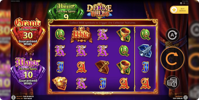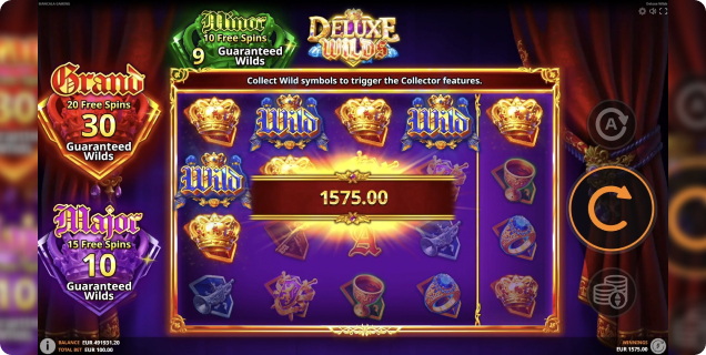 Derrière de luxueux rideaux rouges, Deluxe Wilds invite les joueurs dans un univers royal où chaque tour offre la possibilité de débloquer l'un des trois parcours bonus uniques. En obtenant des combinaisons Scatter spécifiques, les joueurs peuvent déclencher des tours gratuits Mineurs, Majeurs ou Méga, chacun offrant une expérience de jeu distincte.