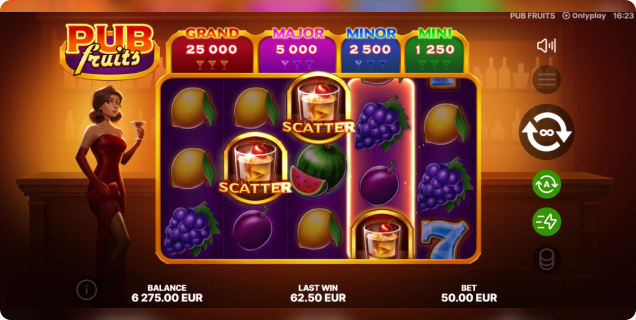 Onlyplay est fier de présenter Pub Fruits, une machine à sous vidéo 5x3 inspirée des jeux de fruits classiques et de l'ambiance décontractée d'un pub animé. Le jeu combine des symboles familiers et un style rétro chaleureux, pour une expérience à la fois traditionnelle et conviviale.