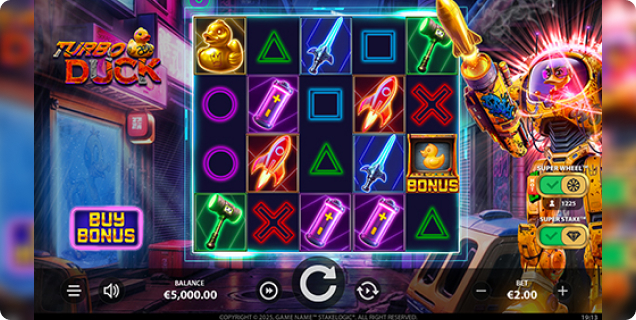 Stakelogic présente Turbo Duck, une aventure de machine à sous à indice d'octane élevé avec 15 lignes de gain, des visuels explosifs et un protagoniste inoubliable: Quack-9, un pilote à plumes intrépide vêtu d'une combinaison de combat mécanisée.