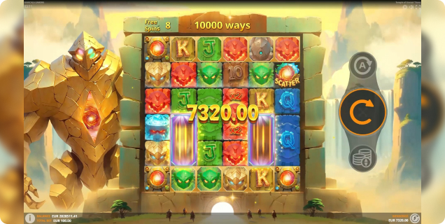Mancala Gaming présente Temple of Eternal Titans, une machine à sous à gains multiples se déroulant dans un univers de temples antiques et animée par des gains en cascade. Construite sur une grille 6x6 avec des rouleaux supplémentaires alimentant les symboles par le haut et par le bas, cette machine à sous offre une expérience dynamique où le plateau de jeu évolue au fil des gains.