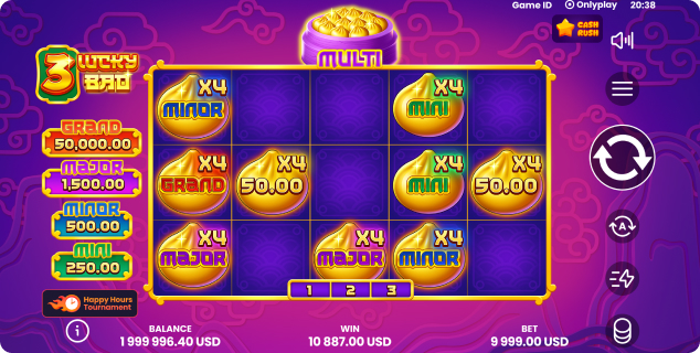 The Coin Bonus unfolds in stages rather than ending abruptly – once the board fills with coins, it clears, new coins appear, and total winnings rise like stacked baskets of bao. Deeper inside the bonus, jackpots come into view – MINI, MINOR, MAJOR, and the coveted GRAND. Filling all nine coin spaces triggers the GRAND – a bright burst of fortune that rewards patience and persistence.