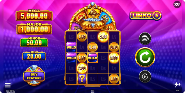 Linko 5™ is built around a simple rule: any five symbols on a payline pays, even if they don’t match. Coin values are shown on the grid, and wins are paid as the total of the values on the line, making results clear as they land.