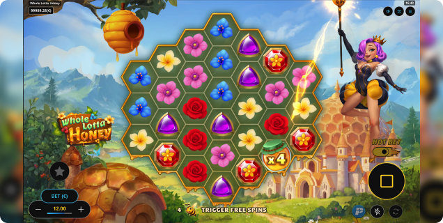 Set within a vibrant beehive kingdom, Whole Lotta Honey drops players into a fast-moving honeycombed grid where symbols pay anywhere in view and every winning combination triggers a tumble, clearing the way for fresh symbols to fall into place and keep the action buzzing.