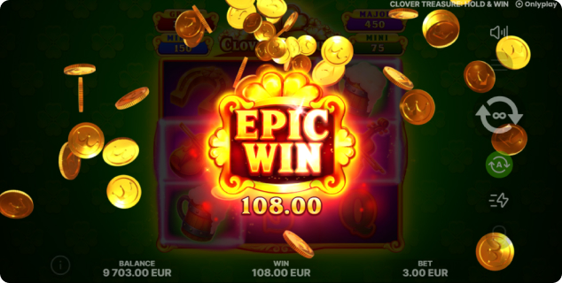 Clover Treasure: Hold&Win also offers four dynamic jackpots – Mini, Minor, Major, and Grand. Their values vary depending on the landed Coin symbols, keeping the jackpot chase closely tied to gameplay. With an RTP of 95.66%, a HIT rate of 10.15%, and medium volatility, the game balances consistent action with exciting win potential.