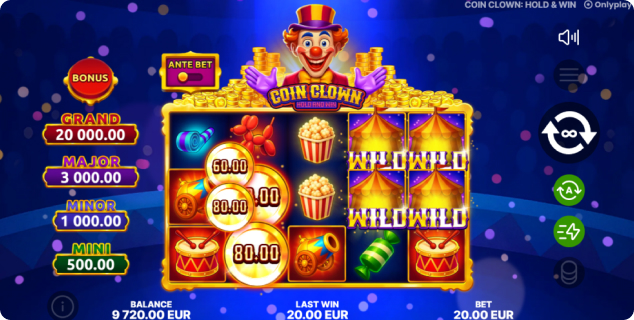 Onlyplay proudly presents Coin Clown: Hold & Win. This 5x3 video slot brings the fun of the circus to life with bright colors, golden coins, sweets, and a smiling clown at the center of the action.