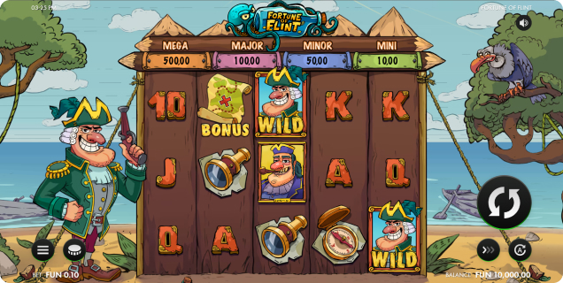 Adding a unique twist to the treasure hunt, Fortune of Flint introduces the Raving Compass bonus, a Hold & Win-style feature activated when six or more coin symbols scatter across the reels. Once launched, the feature awards respins, which reset with each new coin collected, and builds toward one of four exciting jackpot levels — Mini, Minor, Major, or the coveted Mega jackpot — offering players an immersive chase for top-tier payouts.