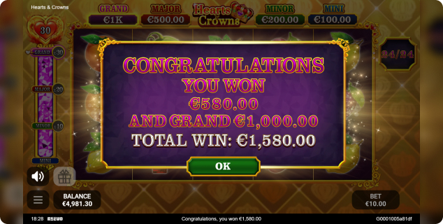 REEVO presents Hearts & Crowns, a royal twist on the timeless fruit slot. This elegant release merges classic charm with modern gameplay, featuring Expanding Wilds, up to 16 Free Spins, and Grand Prizes waiting to be uncovered inside special bonus rounds. With its medium-to-high volatility math model, Hearts & Crowns offers the perfect blend of excitement and consistency — ideal for players transitioning from casual entertainment to higher-stakes sessions.