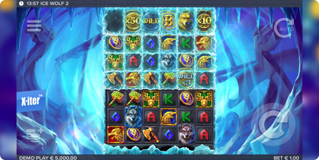 The feature row is the heart of the action — hiding features, multipliers, and bonus symbols beneath frozen blocks. Access them by clearing the ice through winning combinations or by unleashing one of the wolf features.