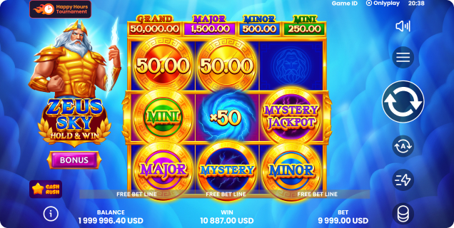 Rooted in Greek mythology, Zeus Sky: Hold & Win takes players into the skies above Mount Olympus, where lightning, gold, and ancient symbols shape every spin. The game is built on a classic 3×3 grid and uses familiar Hold & Win mechanics combined with clean visuals and a strong mythological theme. Each spin feels focused and intense – driven by simple rules, clear symbols, and the constant presence of Zeus watching over the reels.