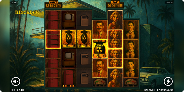 The Smith household looks picture-perfect, but inside, it’s anything but. Disorder plays out on a 4-3-4-3-4-3 layout across 6 reels, with 3 locked Enhancer Cells placed at the bottom of reel 2, 4 and 6. In the real area, Fire Frames will appear randomly on the reels. Any symbol that lands in a Fire Frame will split into 2 symbols. Any regular paying symbol can be split into a max of 16. If a Bonus Symbol lands within the Fire Frame, it upgrades to a Super Bonus Symbol.